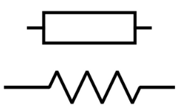 Условное графическое обозначение (УГО) резистора, думаю, знакомо очень многим. Нужно только отметить, что встречаются УГО "по ГОСТ" (на рисунке сверху) и "иностранные" (на рисунке, снизу):