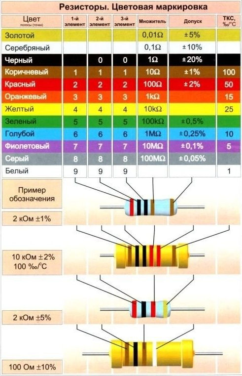 Цветовая маркировка встречается часто. Но на маленьких корпусах, которые к тому же часто окрашены в какой-либо цвет, бывает непросто различить цвета самой маркировки. Я просто приведу здесь картинку с маркировкой из интернета: